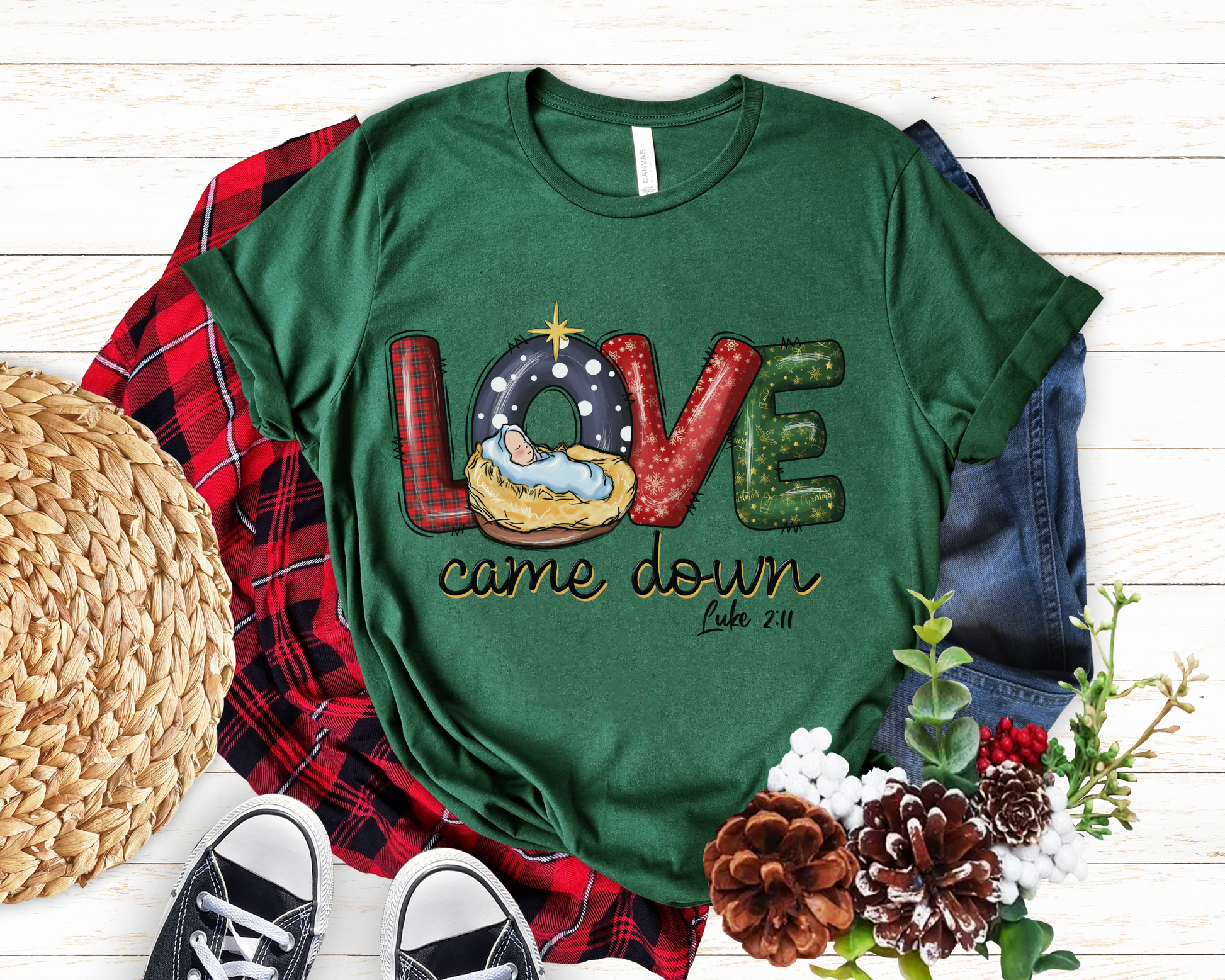 "Experience the true meaning of the season with Love Came Down (Luke 2:11) apparel. This faith wear is a reminder of the greatest love that came down to Earth. Choose from a t-shirt, sweater, or hoodie and spread the message of love this holiday."