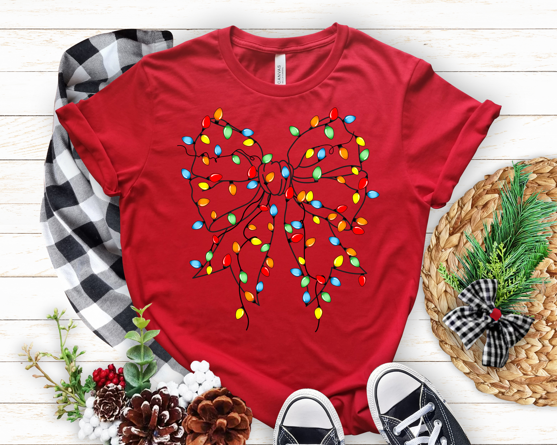 Spread holiday cheer with Christmas Lights Bow shirt, sweatshirt, or hoodie - couture-style! Perfect for all your festive holiday gatherings!