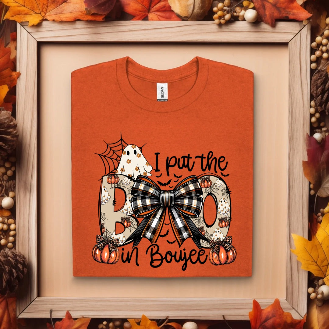 Get ready to be the spookiest and boujee-est this Halloween season with our "I Put The Boo In Boujee" shirt. With a hauntingly chic design, this shirt will elevate your Halloween look and show off your boujee style. Perfect for any Halloween party or trick-or-treating, this shirt is sure to be a hit. Join the boujee ghost gang and put the boo in boujee!