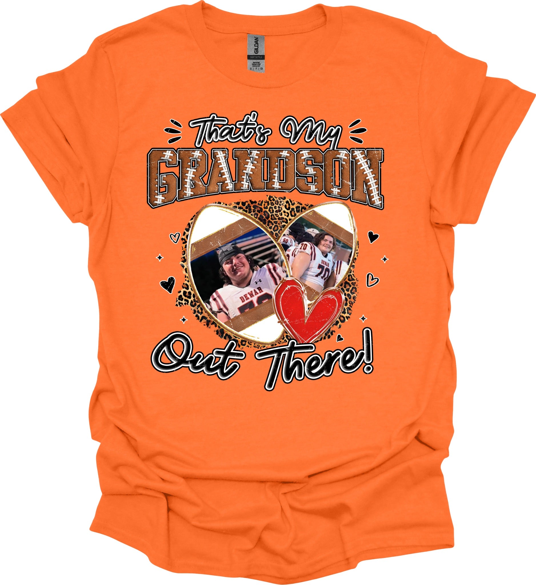 Cheer on your team in style with our PERSONALIZED football top! Made with two photos of your star player and customizable with school colors. Order now to show your team spirit!