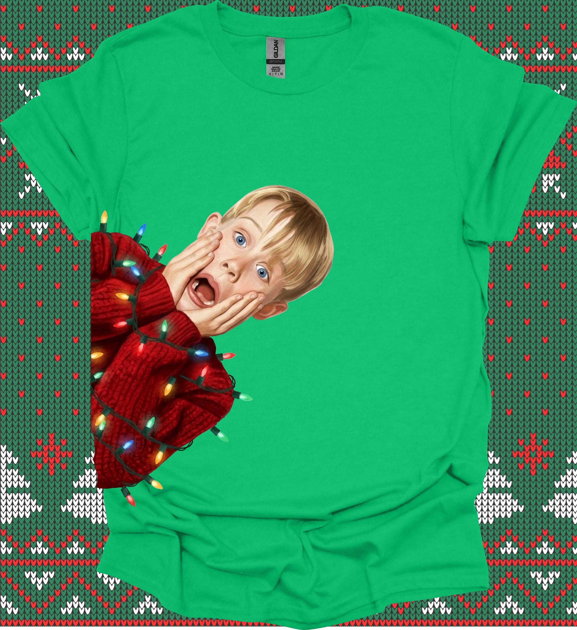 "AHHHHH!" 😱 Don't get left home alone without this shirt! Channel your inner 90s kid with the ultimate holiday throwback. This festive green tee features everyone's favorite home defender, Kevin McCallister, tangled up in Christmas lights and giving his iconic screaming face.